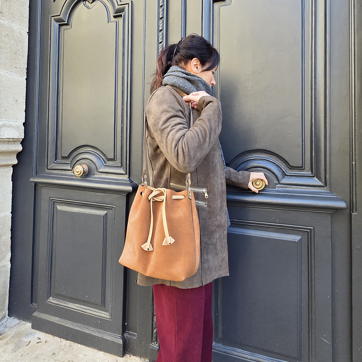 Craquez pour ce sac seau en velours, confectionné en cuir véritable français et fabriqué à la main dans mon atelier. Élégant et intemporel, il offre un toucher doux et une belle tenue. Sa forme pratique accueille vos essentiels du quotidien, tandis que sa bandoulière non réglable assure un porté confortable. Une pièce artisanale unique, alliant savoir-faire et qualité durable.